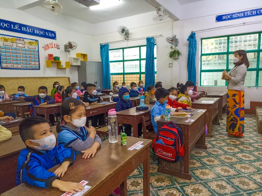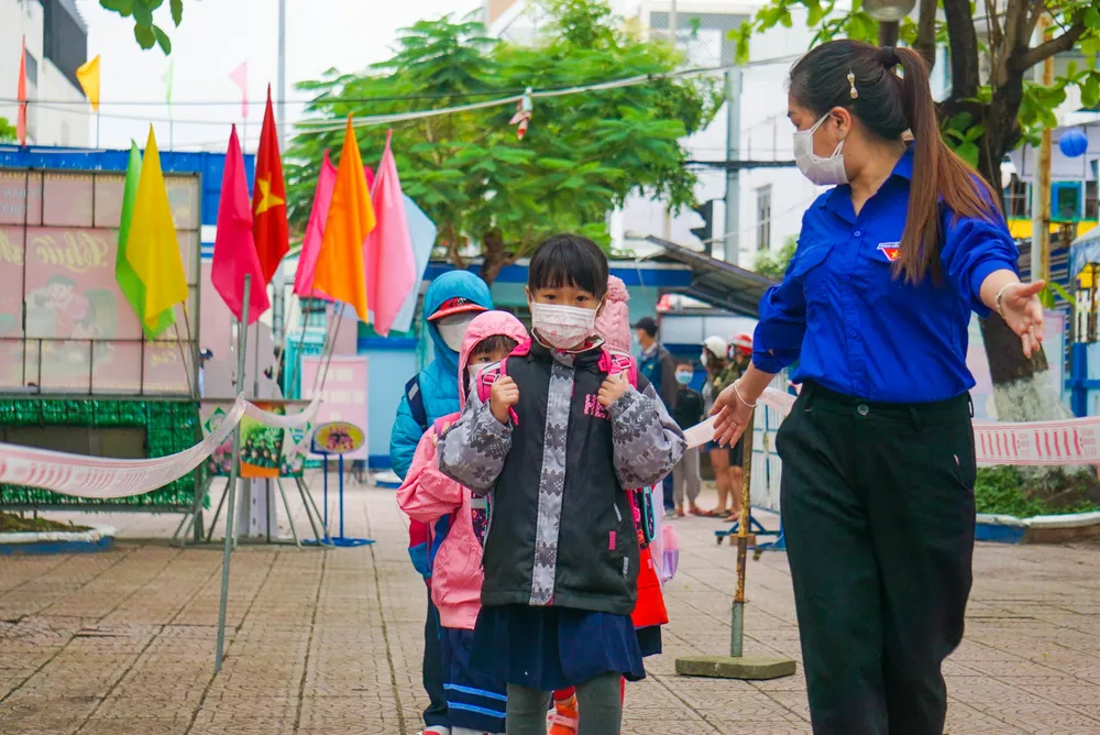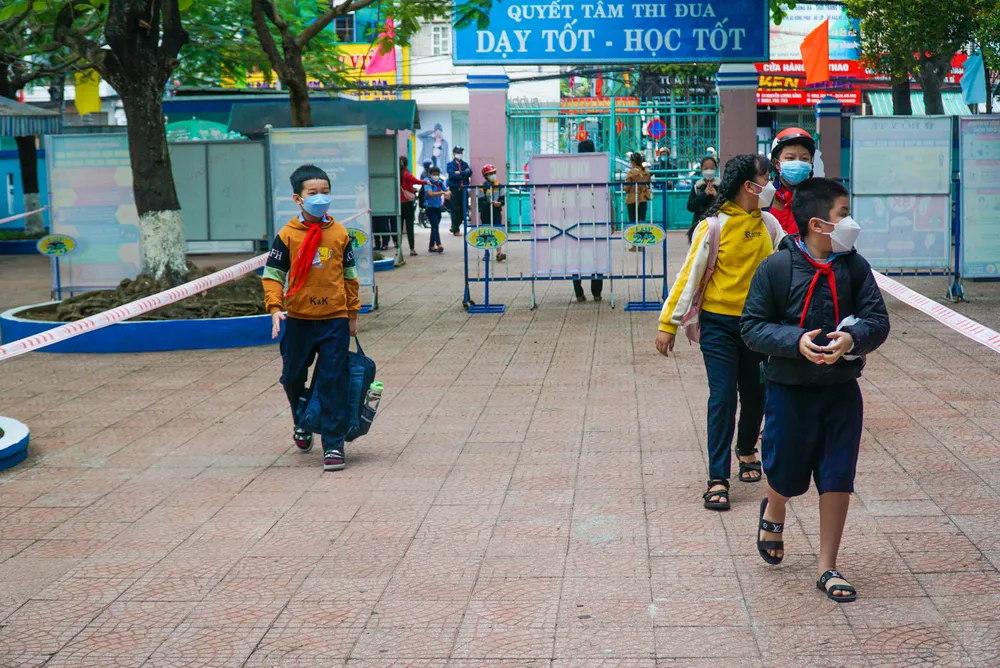 "Hôm nay, học sinh đi học tương đối đầy đủ, chỉ có một số ít em phải ở nhà do thuộc các trường hợp f0, f1. Trước đó, nhà trường đã thực hiện tuyên truyền để phụ huynh yên tâm đưa con em đến trường", thầy Nguyễn Văn Lịch, phó hiệu trưởng trường Tiểu học Ngô Sĩ Liên, cho biết.