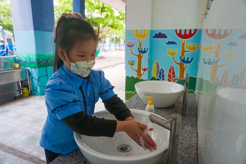 Một số trường bố trí các bồn rửa tay ở vị trí thông thoáng, học sinh được hướng dẫn rửa tay thường xuyên. Ảnh: BT