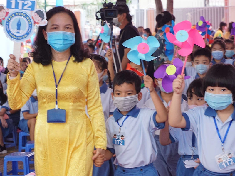 Học sinh Trường Tiểu học Trần Hưng Đạo (quận 1, TP.HCM) trong lễ khai giảng năm học 2020-2021. Ảnh: NQ