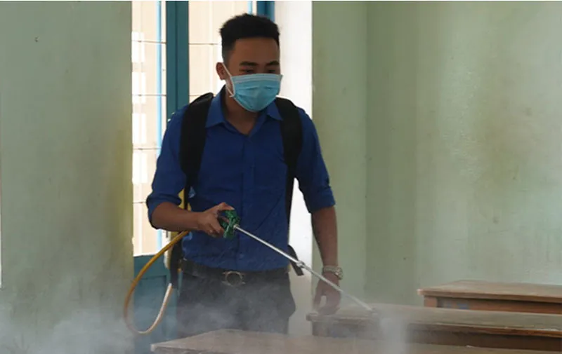 Phun thuốc khử trùng trường học ở huyện Phù Cát (Bình Định). Ảnh: HT