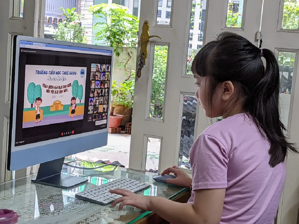 Học sinh trường Tiểu học Thực hành Sài Gòn trong buổi đầu làm quen với cô giáo và các bạn trên môi trường internet. Ảnh: TN