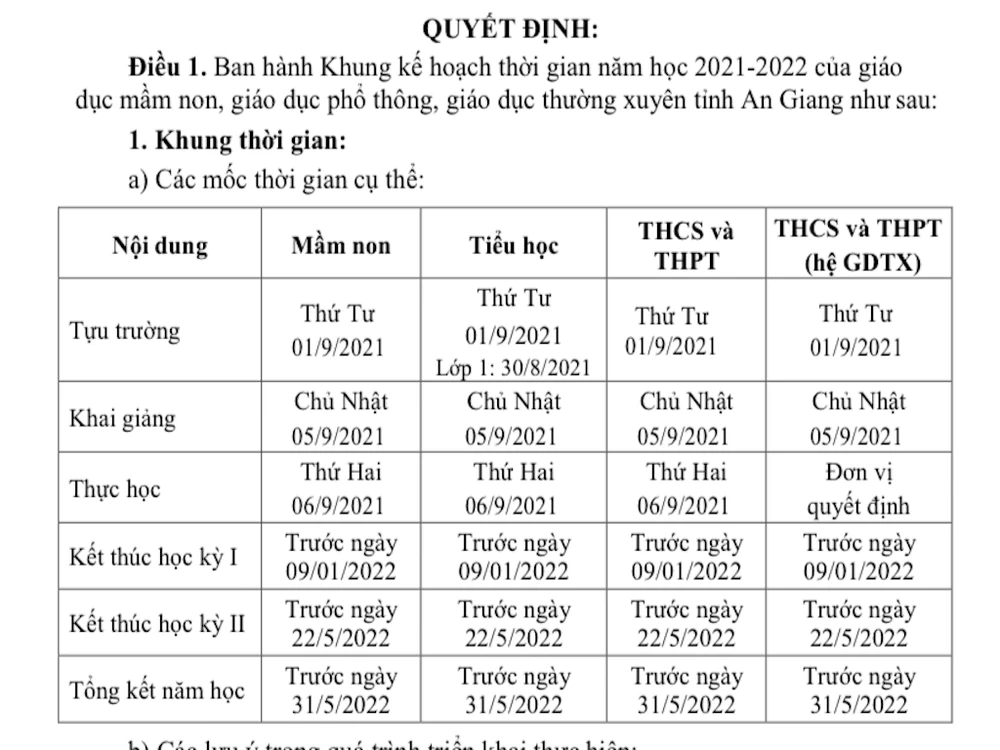 Ngày 12-8, UBND tỉnh An Giang vừa có quyết định Ban hành Khung kế hoạch thời gian năm học 2021-2022 của giáo dục mầm non, giáo dục phổ thông và giáo dục thường xuyên tỉnh An Giang.