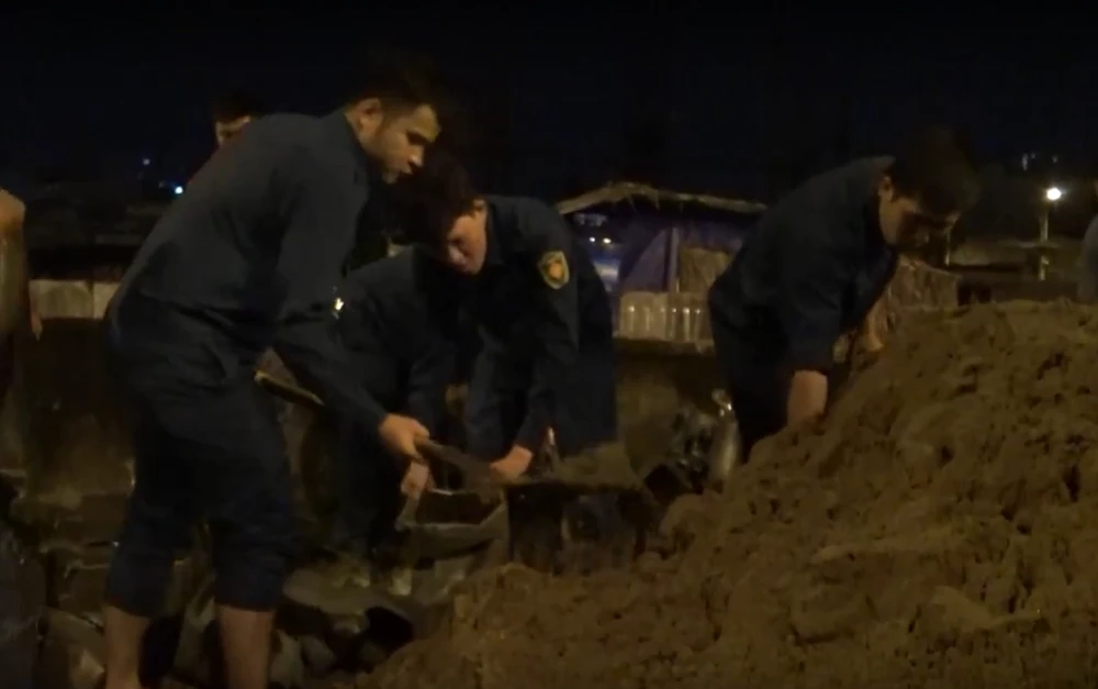 Theo ghi nhận lúc hơn 2 giờ sáng 30-9, gần 200 dân quân tự vệ hầu hết các phường của quận 8 vẫn đang dùng bạt và bao cát đắp vào vị trí bờ bao vừa bị sụp đổ.