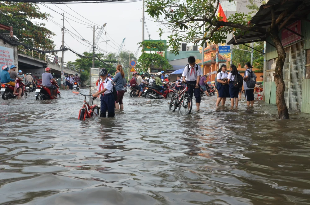 Ghi nhận tại bến Phú Định và Mễ Cốc (quận 8, TP.HCM) nước ngập đến nửa bánh xe, nhiều xe máy bị chết máy, hàng trăm học sinh phải lội nước đi học.