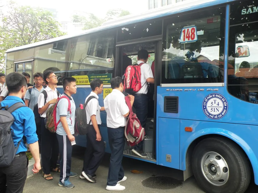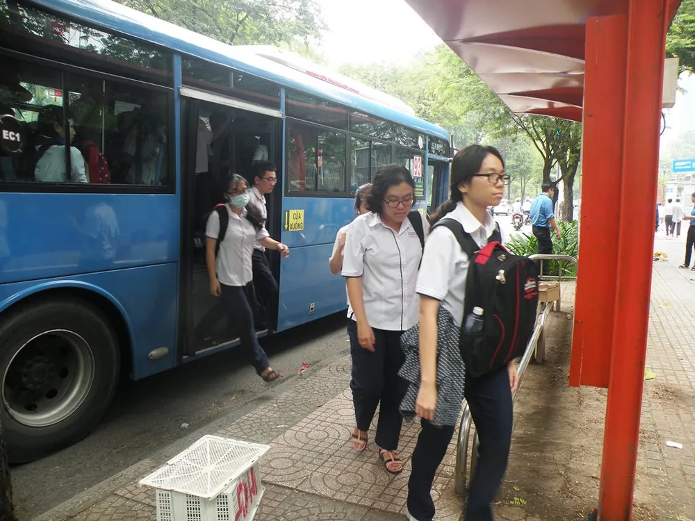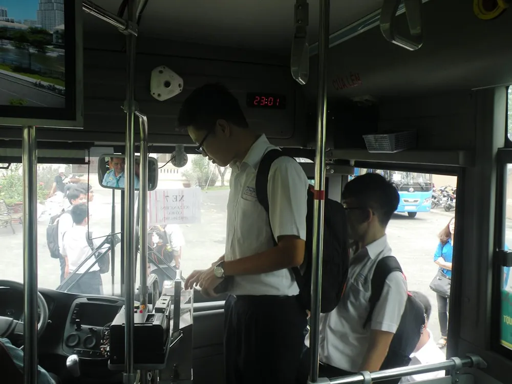 Các em lên xe theo thứ tự và bỏ tiền mua vé