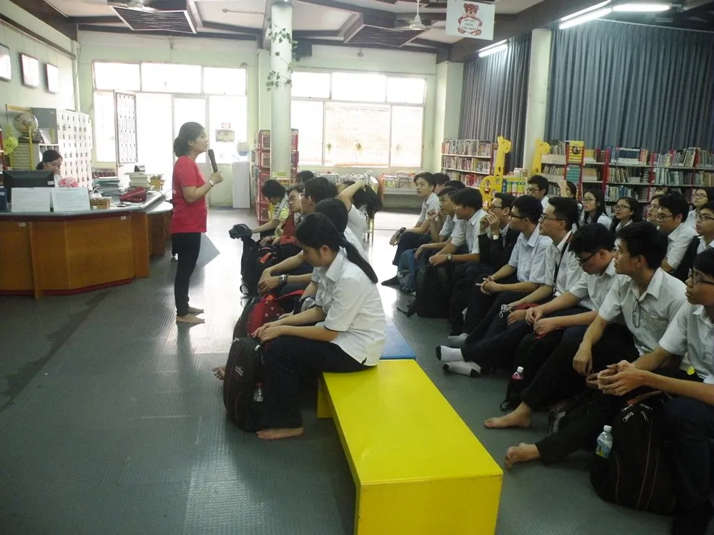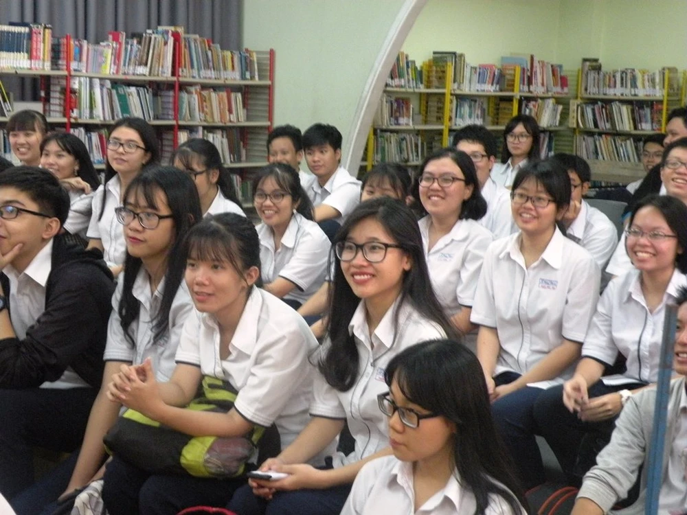 Học sinh lắng nghe cô Huỳnh Quang Thục Uyên, giáo viên sử giới thiệu về thư viện.