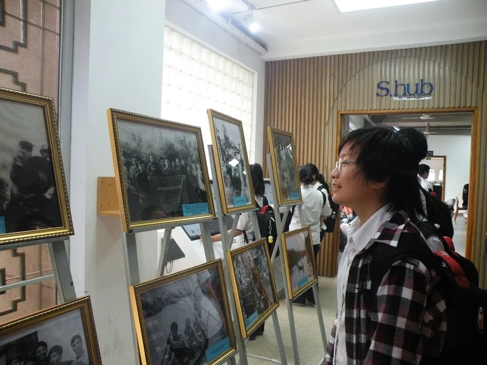 Học sinh tham quan triễn lãm về cuộc tổng tiến công nổi dậy Tết Mậu Thân.