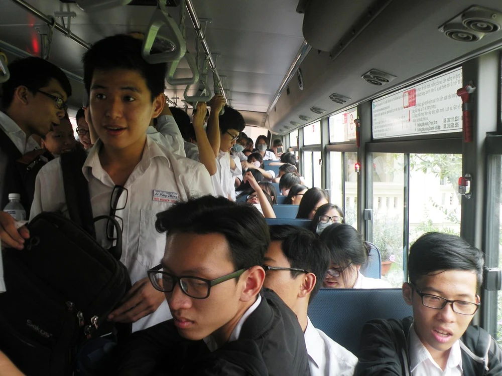 Học sinh khối 12 trường THPT chuyên Lê Hồng Phong xếp hàng lên xe buýt