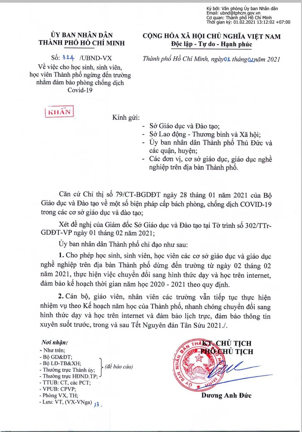 Trưa ngày 1-2, UBND TP.HCM đã có văn bản quyết định về việc cho học sinh nghỉ học phòng tránh dịch COVID-19.