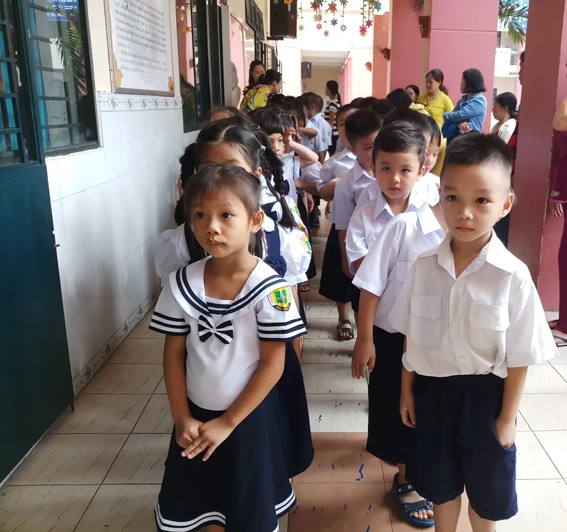 Học sinh Trường Tiểu học Lương Thế Vinh, quận Gò Vấp trong ngày tựu trường.