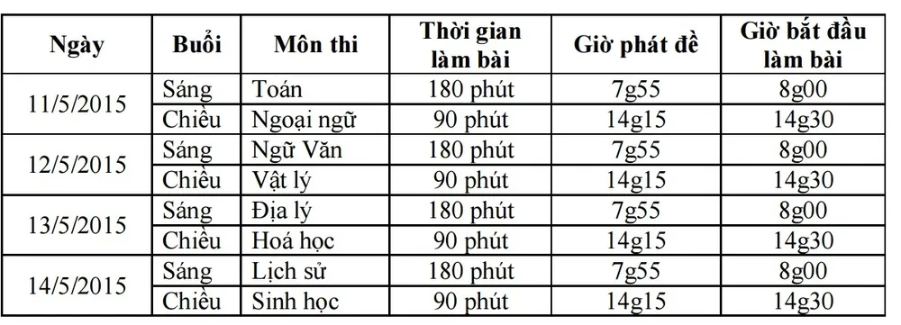 Môn thi sáng nay là môn Toán, chiều là môn Ngoại ngữ. Kỳ thi diễn ra trong 4 ngày với 8 môn. Các môn vật lý, sinh học, hoá học, thi theo hình thức trắc nghiệm. Các môn toán, ngữ văn, lịch sử, địa lý, thi theo hình thức tự luận. Riêng môn ngoại ngữ sẽ thi viết và trắc nghiệm.