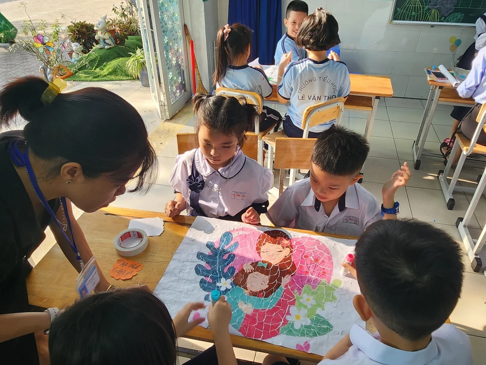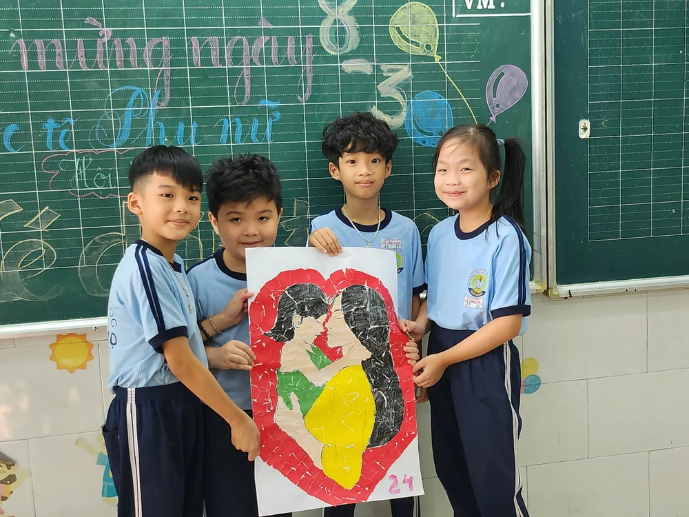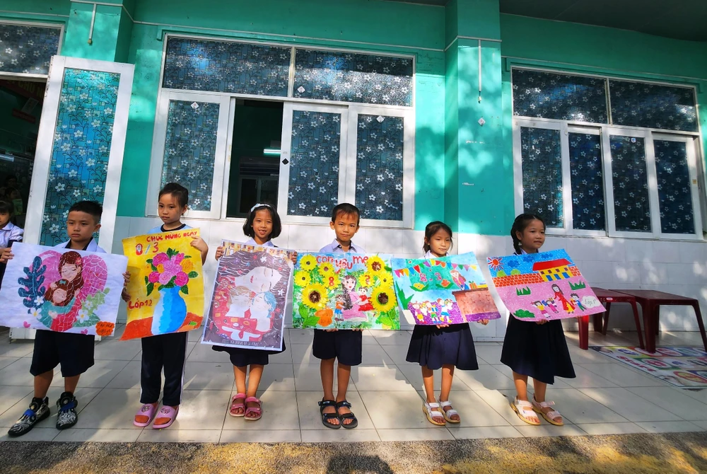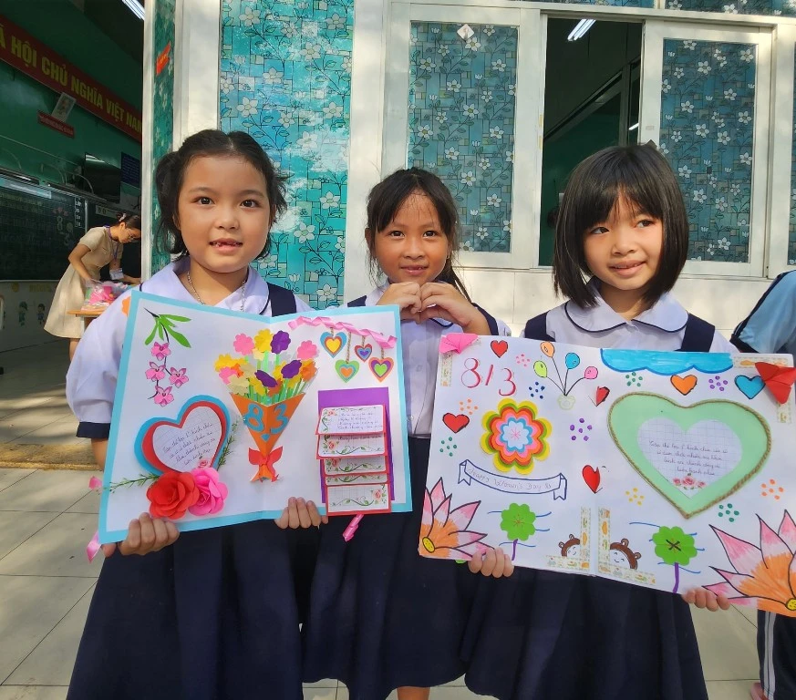 Sáng 3-3, Trường Tiểu học Lê Văn Thọ, quận Gò Vấp, TP.HCM tổ chức hội thi trang trí mẹt, xé giấy dán tranh, viết bưu thiếp cho tất cả khối lớp nhằm chào mừng ngày Quốc tế phụ nữ 8-3.