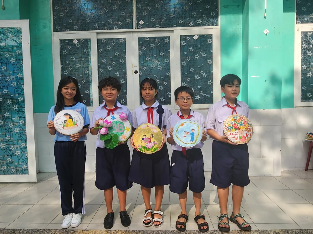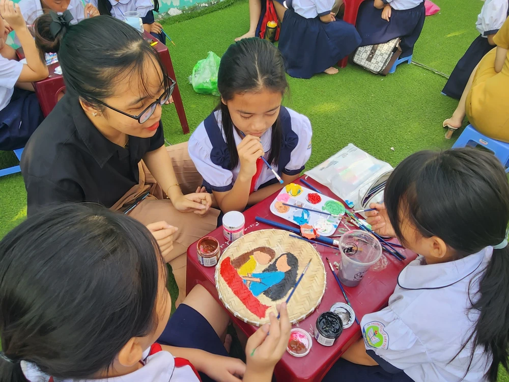 Trong khi đó, học sinh khối 3, 4, 5 lại tham dự phần thi trang trí mẹt. Nguyên vật liệu như mẹt, cọ vẽ, màu được nhà trường chuẩn bị sẵn, cô trò chỉ lên ý tưởng và cùng nhau thực hiện.