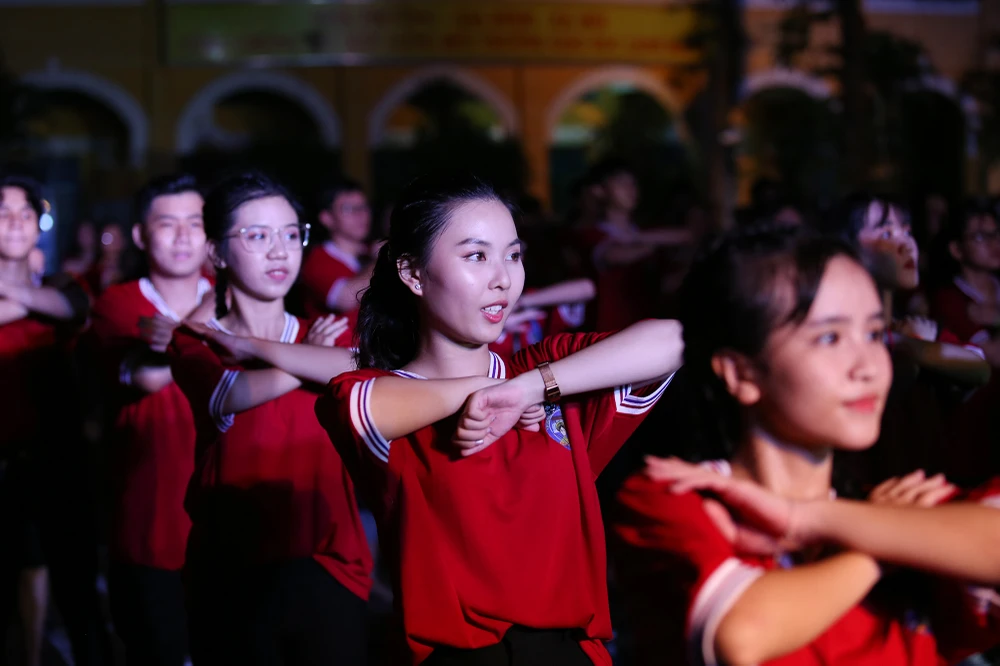 Học sinh khối 12 trong bộ đồng phục của trường THPT Trưng Vương tham gia đồng diễn dân vũ trên nền nhạc về tuổi học trò.