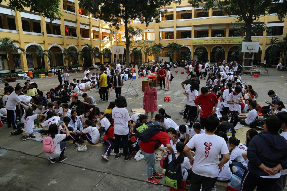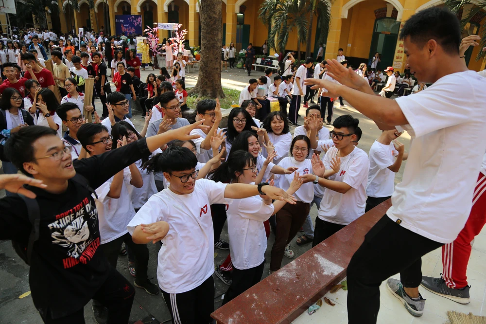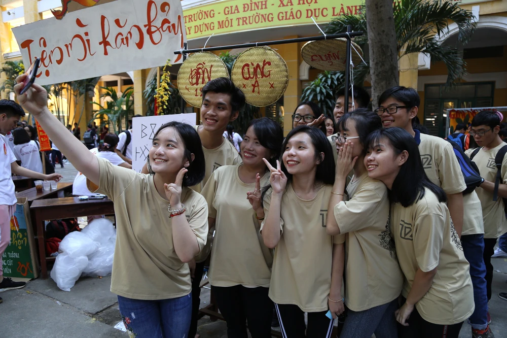 Thầy cô và học sinh THPT Trưng Vương chụp ảnh lưu niệm kết thúc ngày hội.