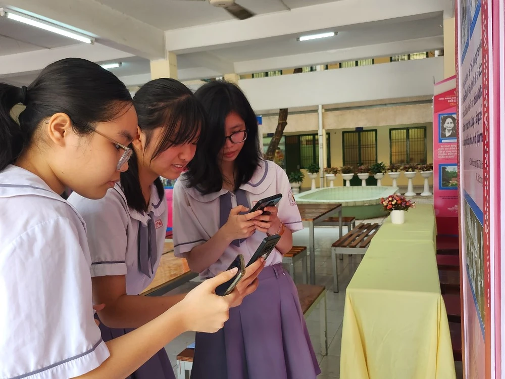 Học sinh dùng điện thoại, quét mã QR để tìm hiểu tư tưởng của Bác Hồ về dân chủ, qua đó vận dụng vào thực tiễn hiện nay. |
