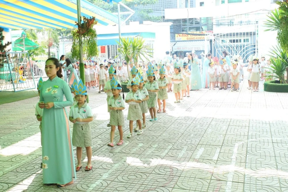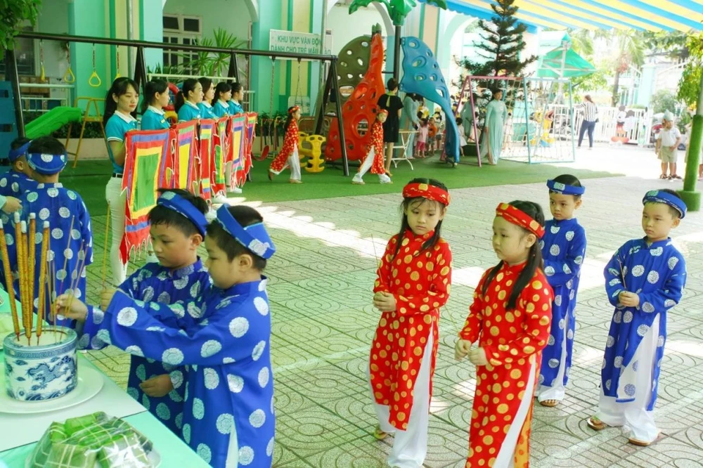 Mở đầu buổi lễ, các bé được giao lưu, trò chuyện tìm hiểu về ý nghĩa ngày mùng 10-3 âm lịch. Tiếp đến trường diễn ra nghi lễ rước cờ, nghi lễ dâng lễ vật, dâng hương. Sau phần lễ, các bé được tham gia phần hội với nhiều trò chơi dân gian như nhảy dây, kẹp cua, nhảy lò cò, tạt lon.