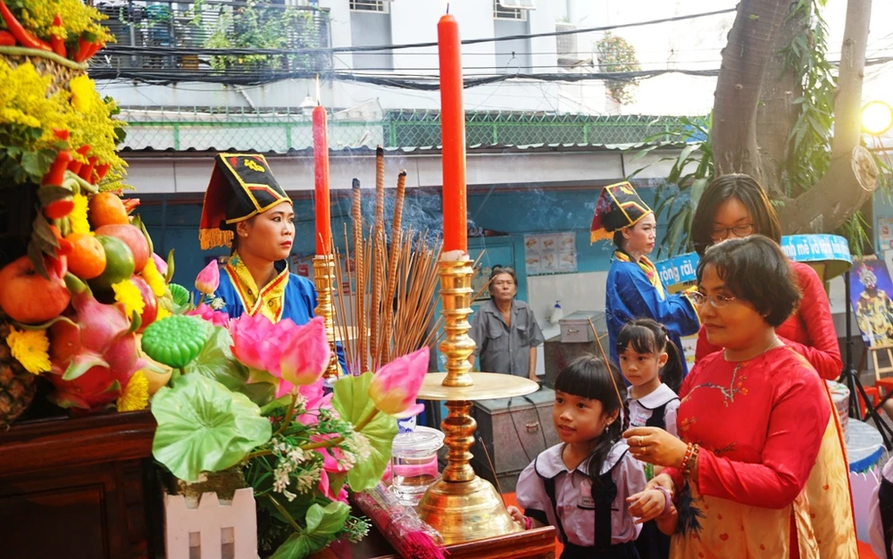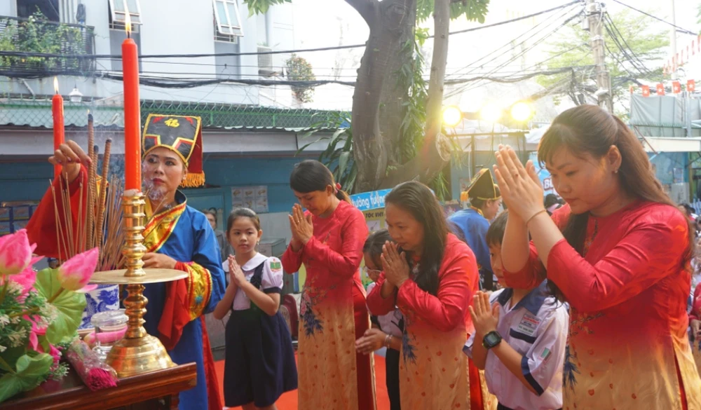 Nghi thức dâng lễ vật của giáo viên trường Tiểu học Nguyễn Trường Tộ, quận 4. Ảnh: NQ