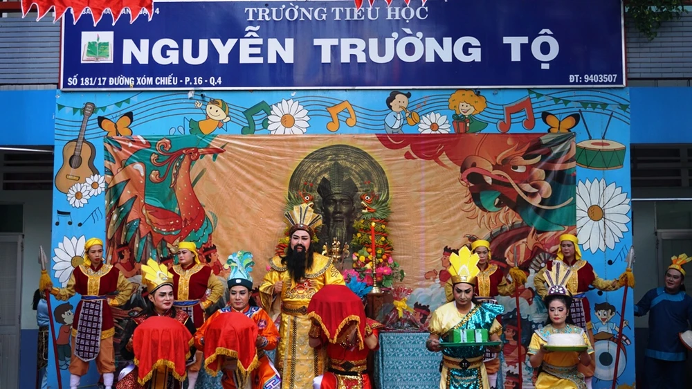 Tại trường Tiểu học Nguyễn Trường Tộ, quận 4, buổi lễ diễn ra trong không khí trang nghiêm và thành kính. Do chương trình tổ chức vào thứ 2 nên trước tiên là lễ chào cờ, sau đó là nghi thức dâng lễ vật, dâng hương.