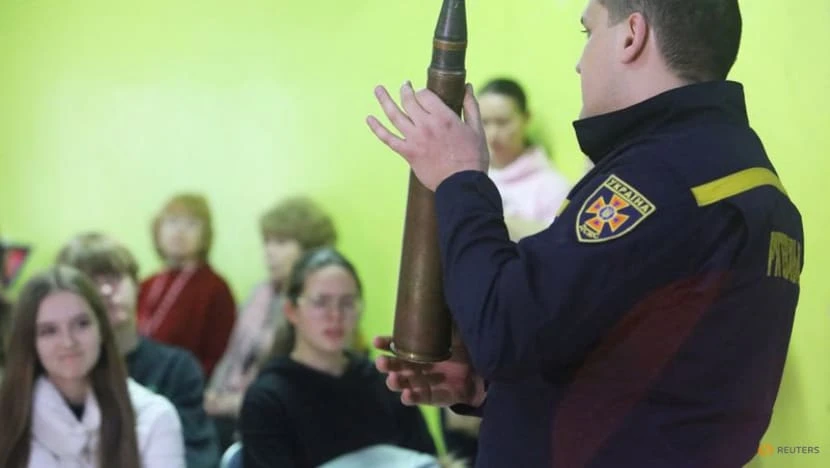 Nhân viên quốc phòng Ukraine đang hướng dẫn các học sinh nhận biết những vũ khí gây nổ. Ảnh: REUTERS