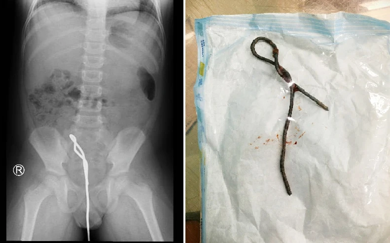 Trước đó, cách nhập viện 2 giờ, bé vào nhà vệ sinh nhét thanh sắt thông cống 0,5 mét vào hậu môn nhưng sau đó rút không ra, được người nhà đưa nhập viện.