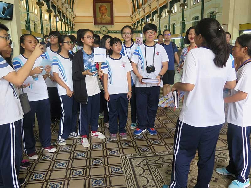 Học sinh Trường THCS Trần Văn Ơn, quận 1 (TP.HCM) trong một giờ học ngoại ngữ và kỹ năng sống tại Bưu điện TP. Ảnh: PHẠM ANH