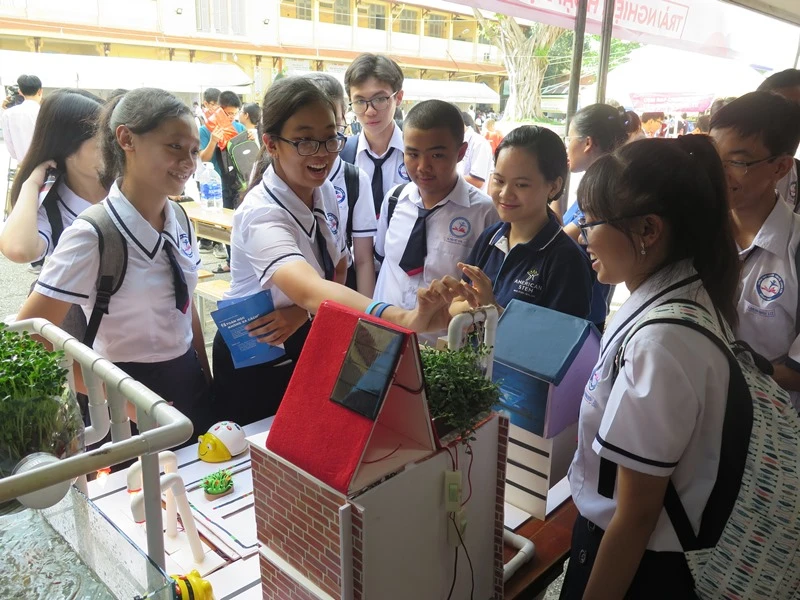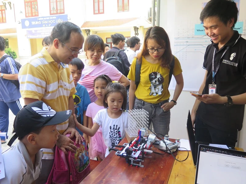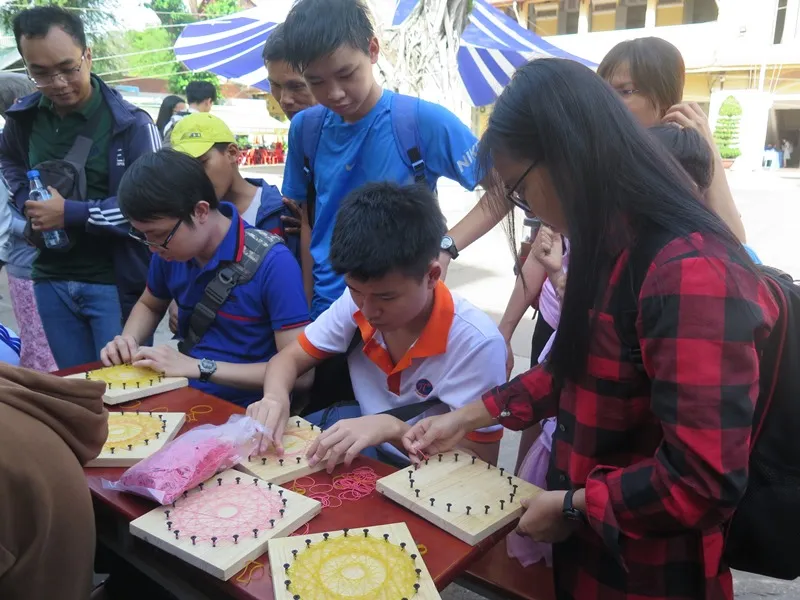 Học sinh tham quan một mô hình ứng dụng toán học tại ngày hội.