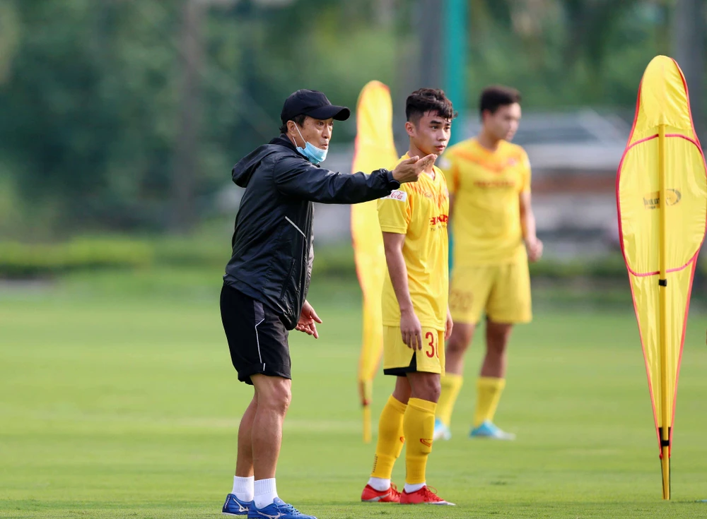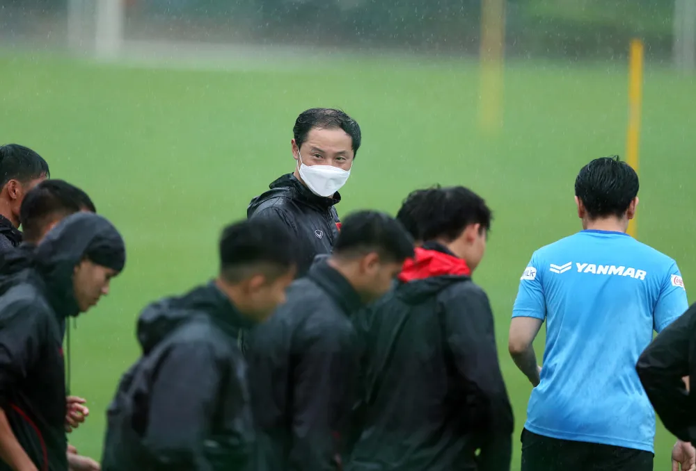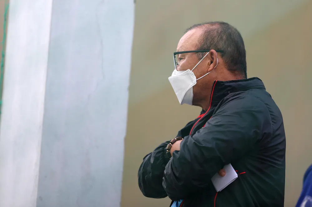 Trợ lý Kim Han Yoon cẩn trọng với chiếc khẩu trang huấn luyện một nhóm cầu thủ có nhiều cái tên lần đầu hít thở không khí đội tuyển.