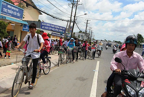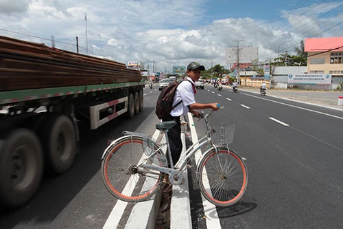 Các em học sinh vô tư đi bộ, dẫn xe nhẩn nha qua QL1A như đi trong sân trường bất chấp nguy hiểm đến tính mạng