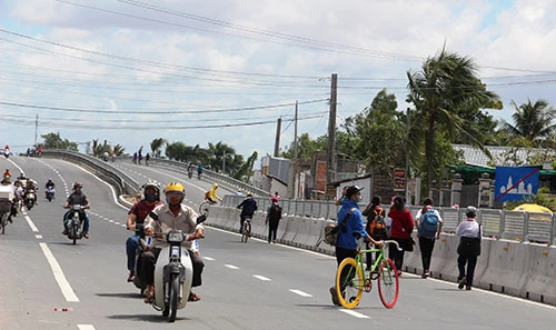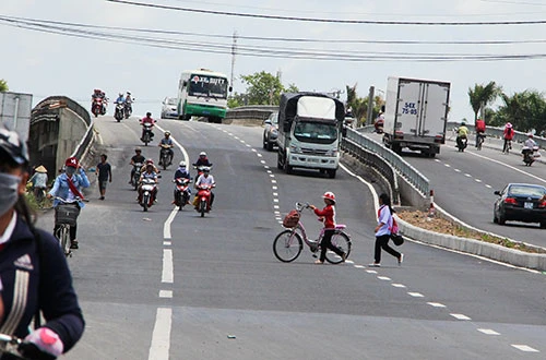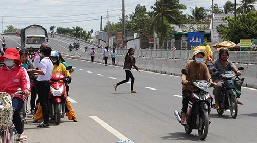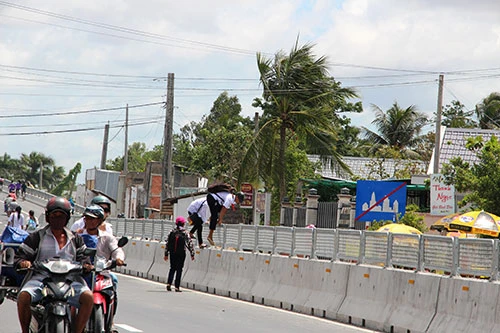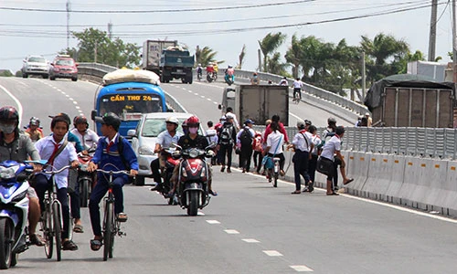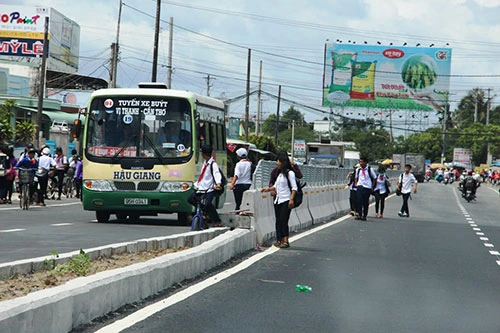 Nguy hiểm hơn là ở những khu vực trường học, các em học sinh vô từ chạy ào ào qua đường hoặc nhẩn nha đi bộ dọc theo dải phân cách giữa đường rồi leo qua dải phân cách cao hơn 1,5m…Ngày 24-8, PV BáoPháp luật TP.HCMghi nhận một số hình ảnh các em học sinh đang “đánh đu với tử thần” khi vượt QL1A – đoạn ngang qua khu vực Trường THCS thị trấn Cái Tắc (huyện Châu Thành A, tỉnh Hậu Giang).