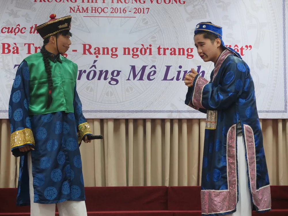 Chia sẻ về vở diễn, em Cao Quốc Thắng, là học sinh và cũng là đạo diễn tiết mục cho lớp 11A1, cho hay hình thức cải lương đơn thuần đã rất phổ biến rồi nên em đã cải biên sang tuồng cổ hồ quảng với tên gọi là “Mê Linh định quốc”. Trong đó, tụi em tự sáng tác thêm và chỉ giữ lại những gì đặc trưng đã quá nổi tiếng rồi.