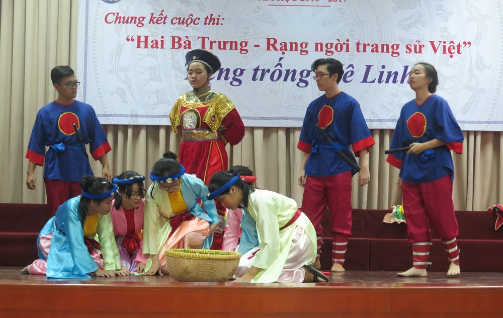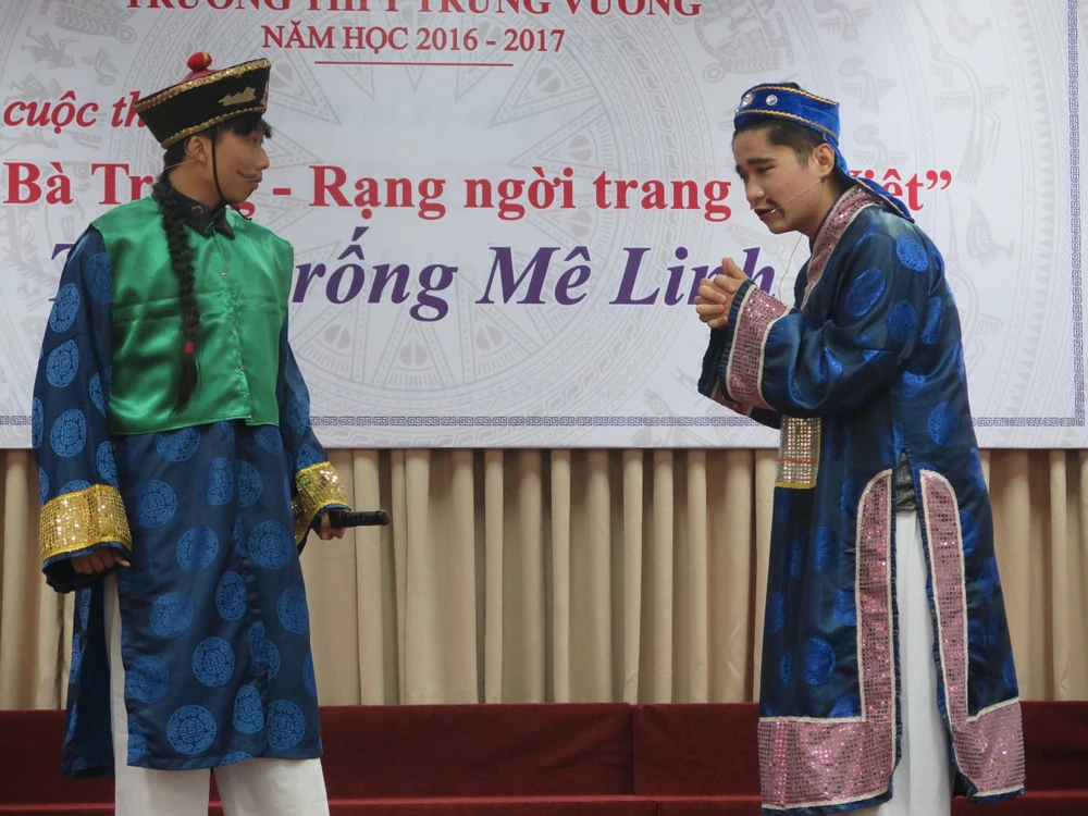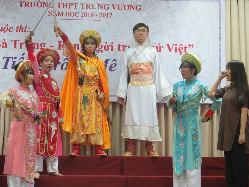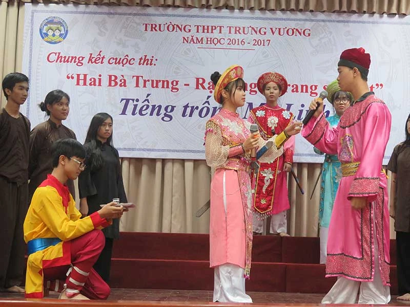 Đó là buổi chung kết cuộc thi “Hai Bà Trưng - Rạng ngời trang sử Việt” với chủ đề “Tiếng trống Mê Linh” do nhà trường phát động từ tháng 9-2016 với ba tiết mục do ba lớp 10A8, 12A12 và 11A1 thể hiện.