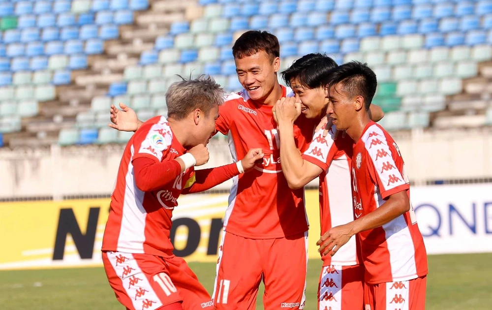 Phi Sơn, Xuân Nam và Công Phượng ăn mừng bàn thắng tại AFC Cup. ẢNH: HCMFC