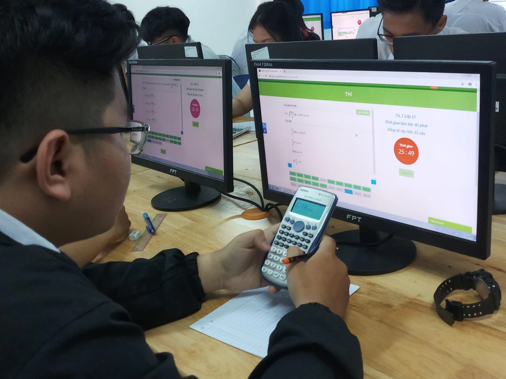 Học trò thích thú khi làm bài thi môn Toán trên máy tính. Ảnh: NGUYỄN QUYÊN