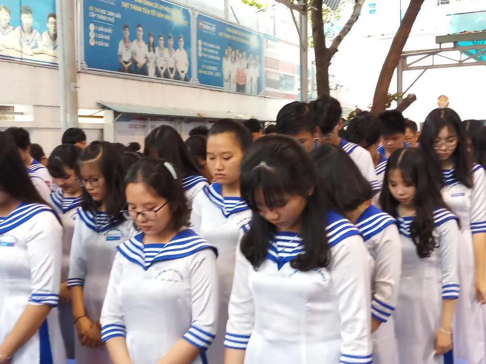 Học sinh Trường THPT Nhân Việt dành một phút tưởng niệm chiến sĩ Gạc Ma. Ảnh: NGUYỄN QUYÊN
