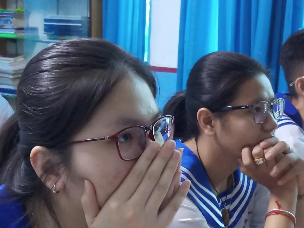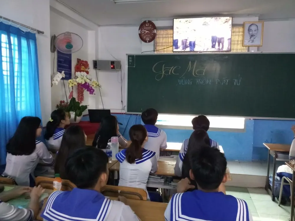 Học trò lớp Gạc Ma xem bộ phim tư liệu về sự kiện Gạc Ma. Ảnh: NGUYỄN QUYÊN