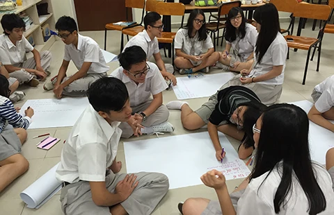 Các nhóm trao đổi công việc trong các giờ học kỹ năng để chuẩn bị đi thực tế thực hiện dự án. Ảnh: PHẠM ANH
