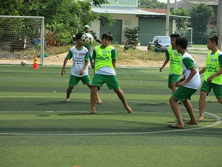 Các cầu thủ nhí thi bài đối kháng 3 chống 3 băng đôi chân trần