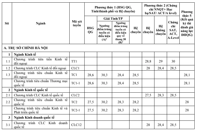 Điểm trúng tuyển theo nhóm ngành của Đại học Ngoại thương - cơ sở Hà Nội như sau: