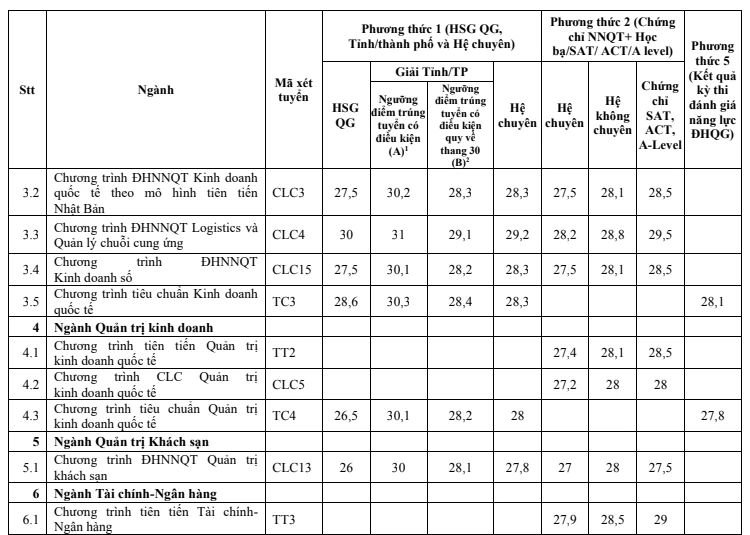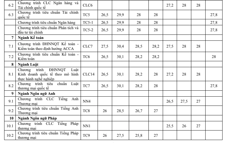 Điểm trúng tuyển theo nhóm ngành của Đại học Ngoại thương - cơ sở TP Hồ Chí Minh như sau: