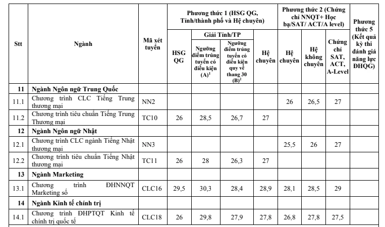 Theo đó, điểm trúng tuyển ngành Ngôn ngữ Trung Quốc - chuyên ngành Tiếng Trung Thương mại là ngành có mức điểm cao nhất với 28,5 điểm (tổ hợp D01)