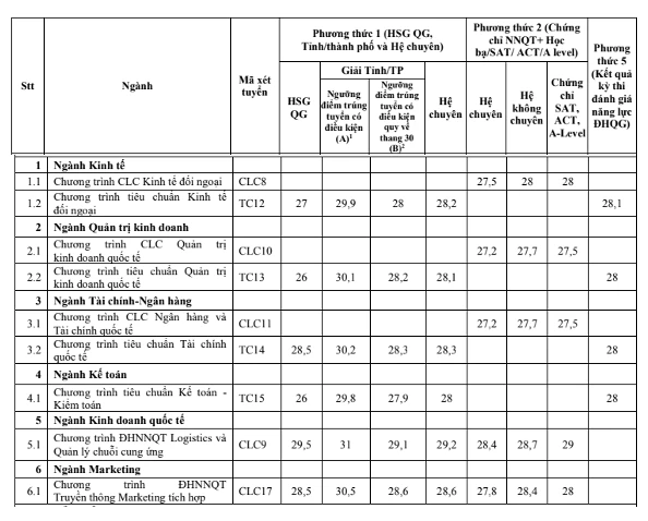 Tiếp theo là mức điểm 28,3 của tổ hợp A00 đối với ngành Kinh tế - chuyên ngành Kinh tế đối ngoại và chuyên ngành Thương mại quốc tế.