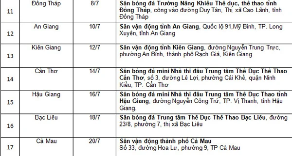 Sau khi tuyển sinh tại thành phố Hồ Chí Minh, từ ngày 16/6 tới ngày 20/7, Ban tuyển trạch của học viện bóng đá NutiFood- HAGL- Arsenal- JMG sẽ tiếp tục tới các tỉnh để tìm kiếm những tài năng bóng đá cho học viện. Điều kiện thi tuyển vào học viện là tất cả thí sinh nam có độ tuổi 11-12 tuổi (sinh năm 2003-2004) yêu thích và có năng khiếu bóng đá đều có thể tham gia. Phụ huynh trên khắp toàn quốc có thể dẫn con em mình tới một trong 17 địa điểm tuyển sinh dưới đây để tham gia thi tuyển.