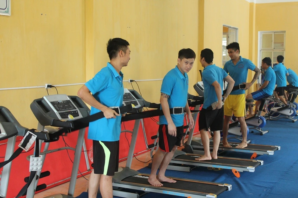Học viên tập thể hình trong trung tâm cai nghiện. Ảnh: VIẾT LONG