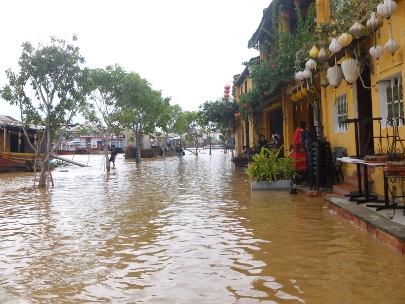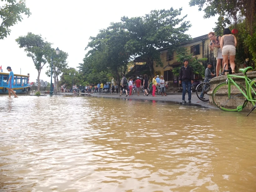 Nước lũ cũng đang dâng lên mép tuyến đường dẫn vào di tích Chùa Cầu. Nhiều du khách tham quan phố cổ Hội An cảm thấy rất lo lắng. Lực lượng dân phòng của TP Hội An nhanh chóng kiểm tra, đề phòng người dân vào các khu vực nguy hiểm có khả năng nước dâng cao.