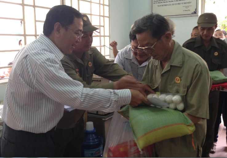 Ông Hoàng Chương, Phó Tổng biên tập Báo Pháp Luật TP.HCM trao quà tết cho một cựu chiến binh.
