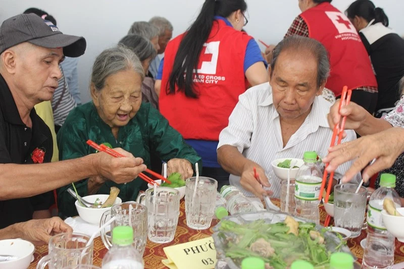 Niềm vui của các cụ già tại "bữa ăn người già" do Hội Chữ thập đỏ quận 8 tổ chức. Ảnh: HL