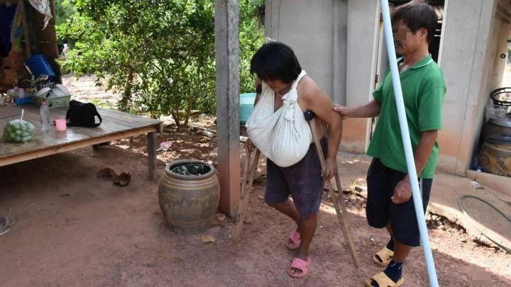 Bộ ngực của cô này bắt đầu phát triển khoảng 9 tháng trước và ngày càng to và nặng đến nổi cô phải dùng nạng để đi lại. Ảnh: Phitsanulok Hot News