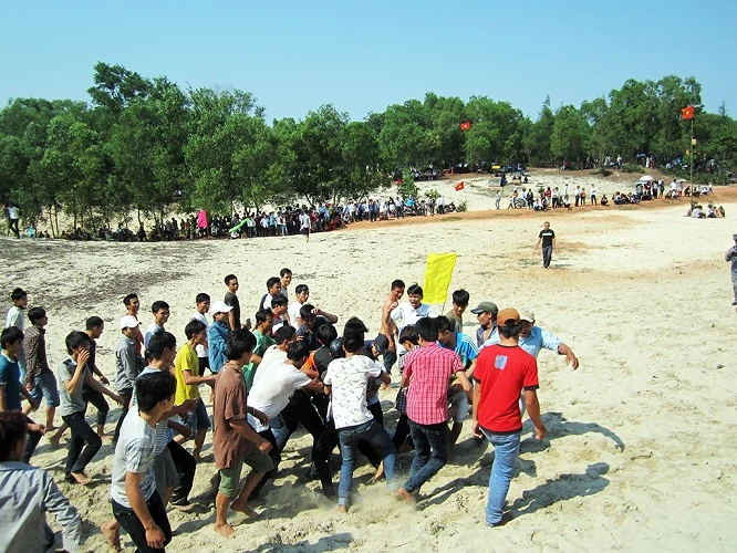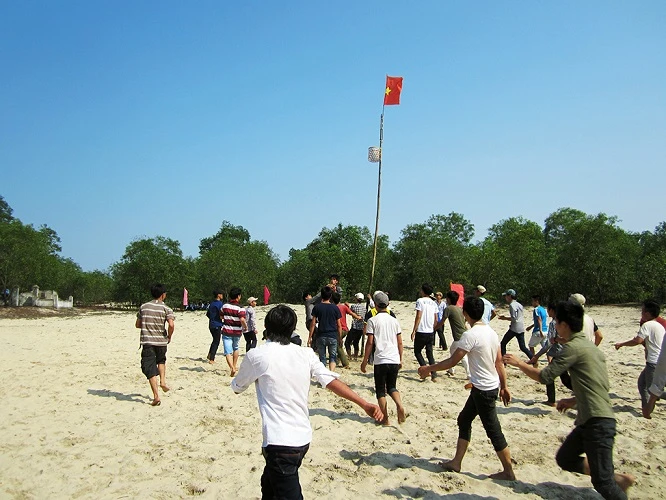Giữa bãi cát rộng khoảng 500 m2, có 2 cột cù (hay còn gọi là cột gôn) bằng cây tre đực. Mỗi cột gôn có một giỏ được đan bằng tre ở độ cao khoảng 5 mét. Trò chơi thu hút đông đảo thanh niên thậm chí cả cụ già cũng háo hức tham gia. Giữa bãi cát trắng, hàng trăm thanh niên lực điền vẫn xoay trần và tranh giành nhau quyết liệt quả cù.