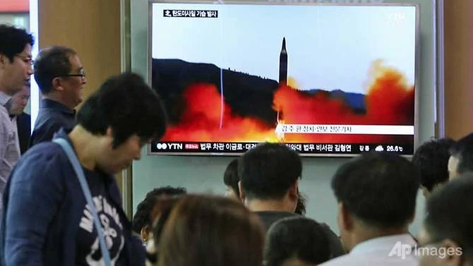 Người dân Hàn Quốc theo dõi bản tin về việc Triều Tiên phóng tên lửa. Ảnh: AP